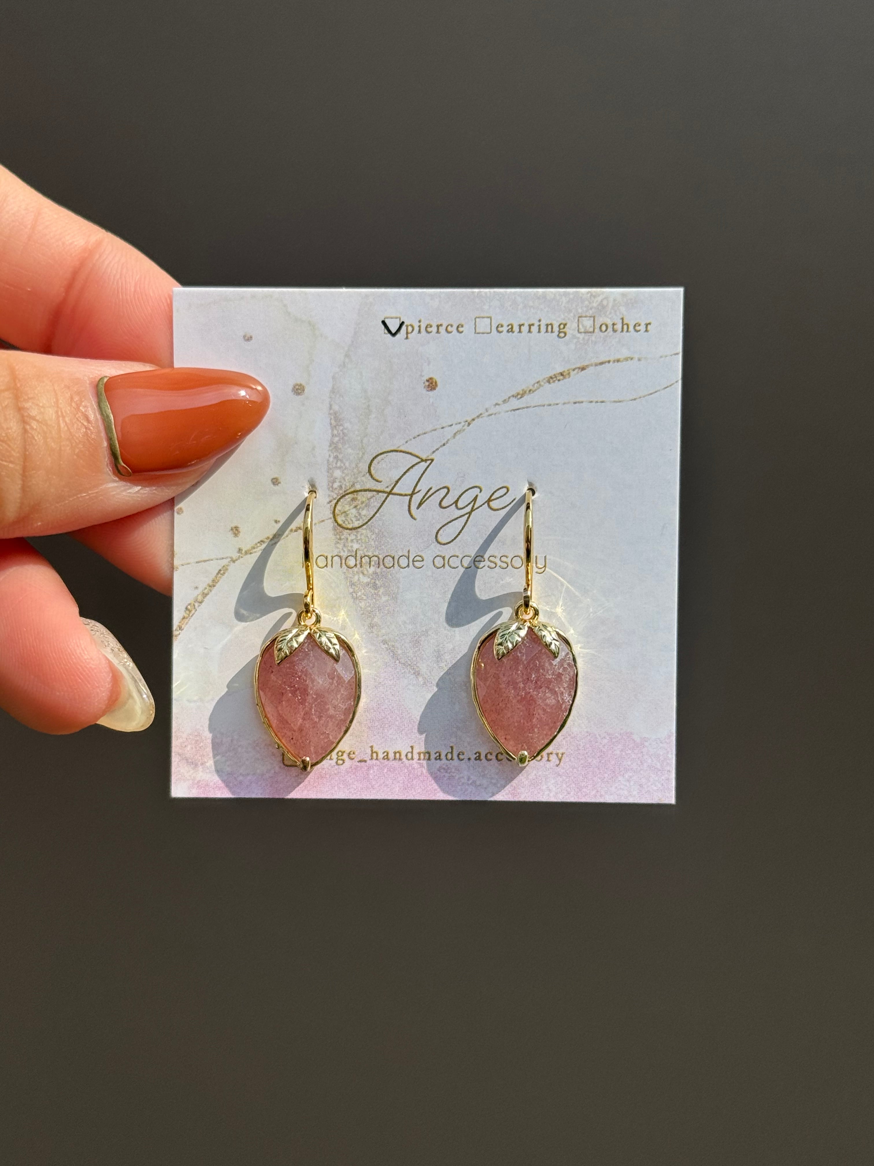 ストロベリークォーツで作られたこの苺型ピアスは、まるで本物のいちごを耳元に飾っているようなほっこりとした存在感を放ちます。自然の持つ美しさを生かしたデザインで、キラリと光るクリスタルのように輝く表面が、あなたの顔周りを明るく彩ります。耳元で揺れるたびに、フェミニンな雰囲気を演出してくれる特別なアイテムです。軽量で着用感も良く、デイリールックから特別なシーンまで幅広く活躍します。あなたの個性を引き立てるこのピアスで、さりげなくオシャレを楽しんでみてはいかがでしょうか。