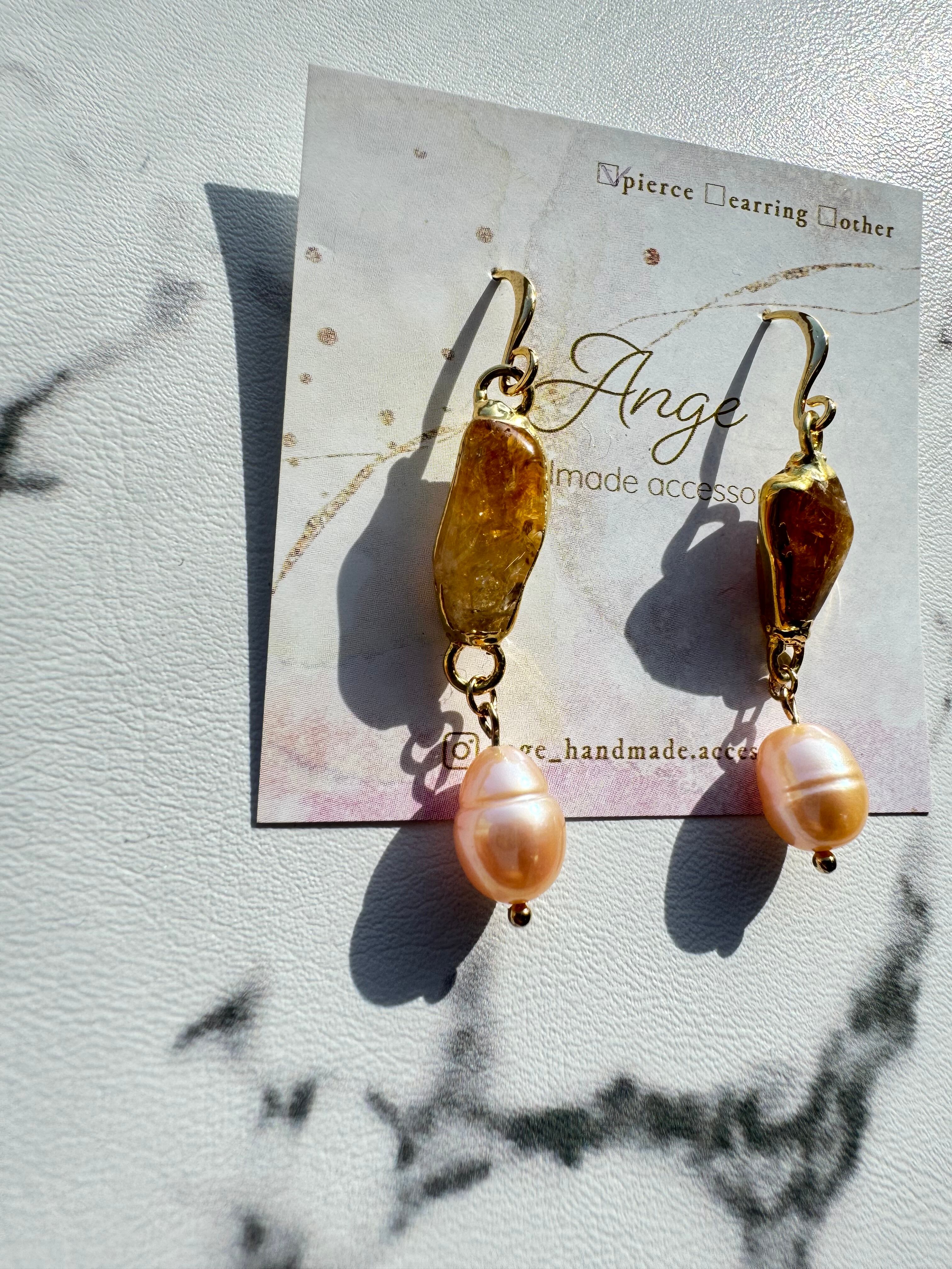 シトリンとコーラルピンクパールのピアス